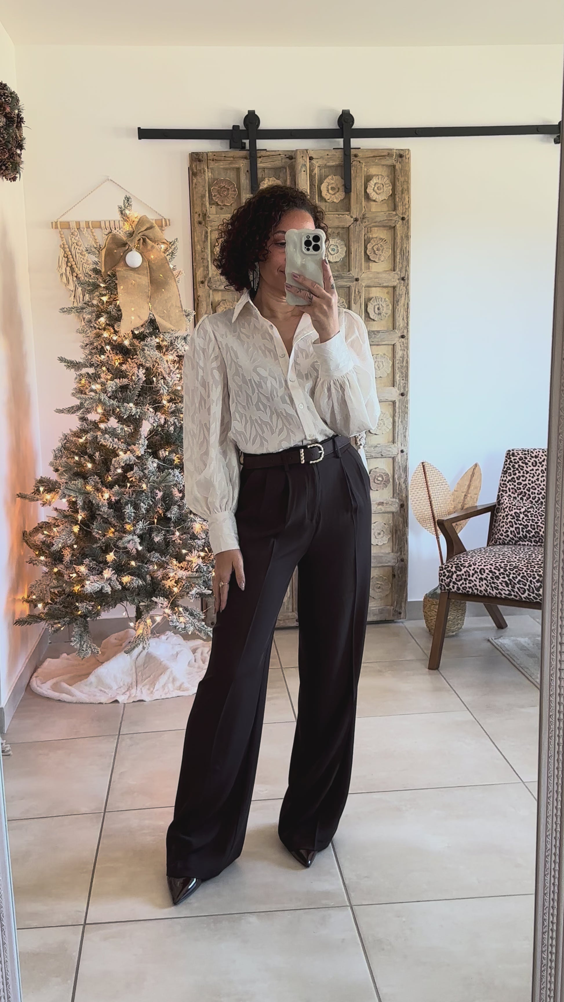 Chemise écrue en jacquard texturé, travaillée et lumineuse. Ses manches volumes apportent élégance et caractère tout en restant facile à porter au quotidien comme en soirée.