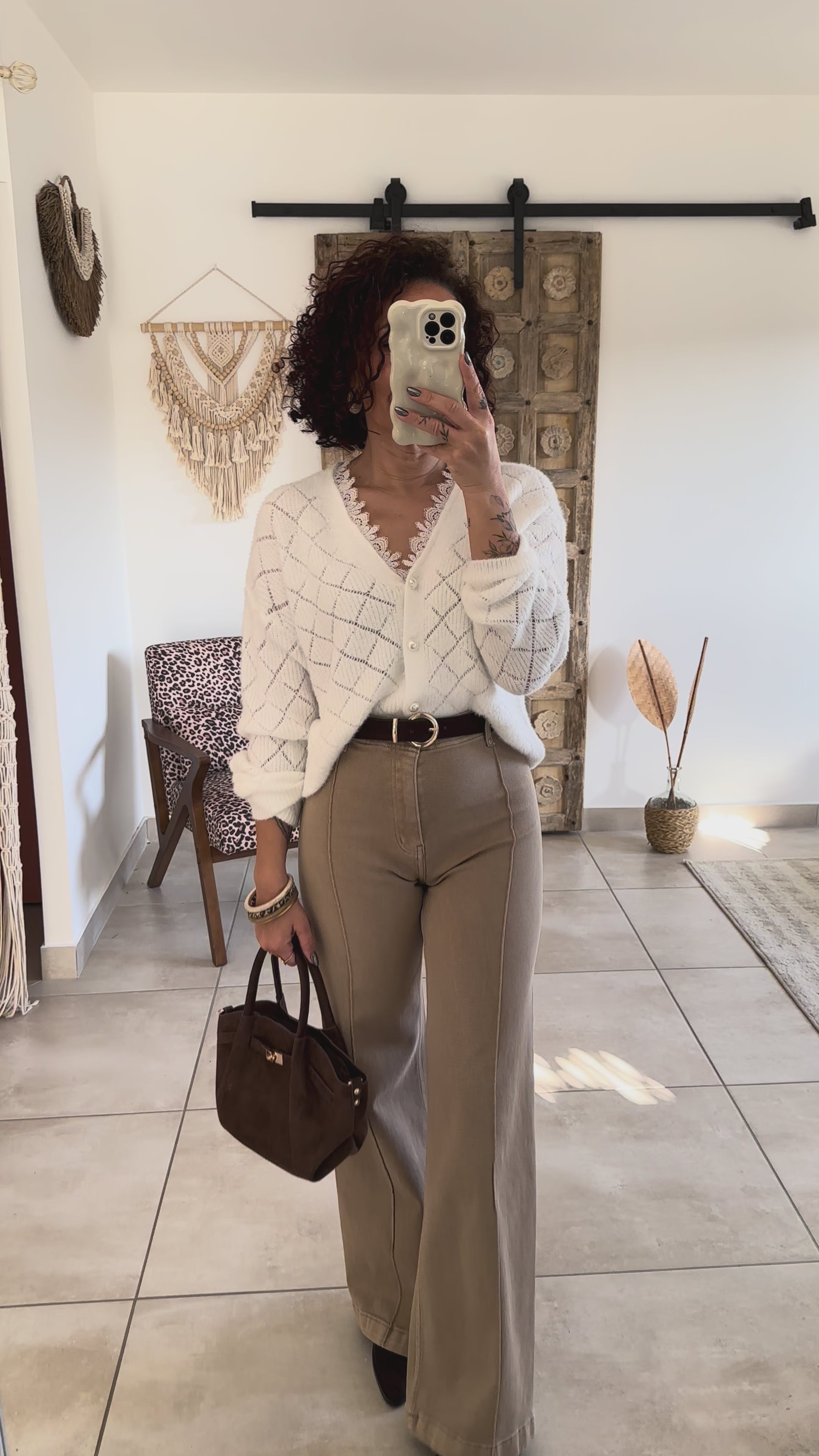 Ce jean beige à la coupe droite est une alternative lumineuse au denim classique. Sa teinte douce allège la silhouette et se marie parfaitement avec les tons chauds de la capsule Soft Love.