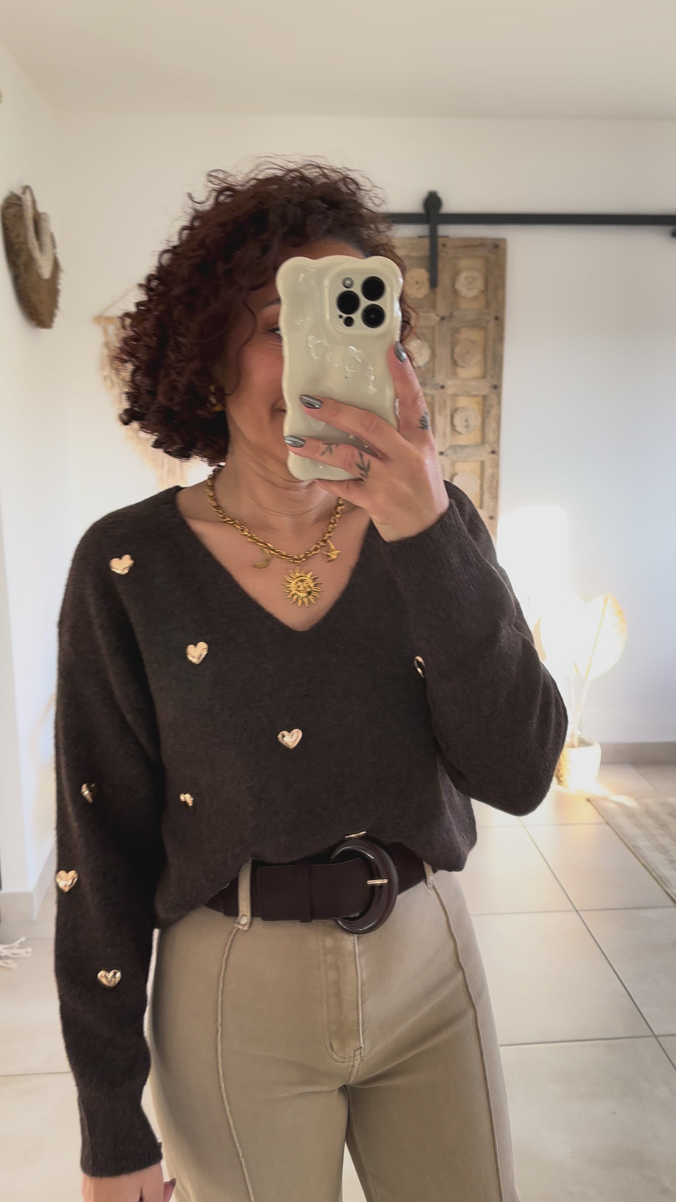 Ce pull chocolat au col V séduit par sa douceur et son élégance naturelle. Les petits cœurs délicatement posés apportent une touche féminine et réconfortante, fidèle à l’esprit Soft Love.