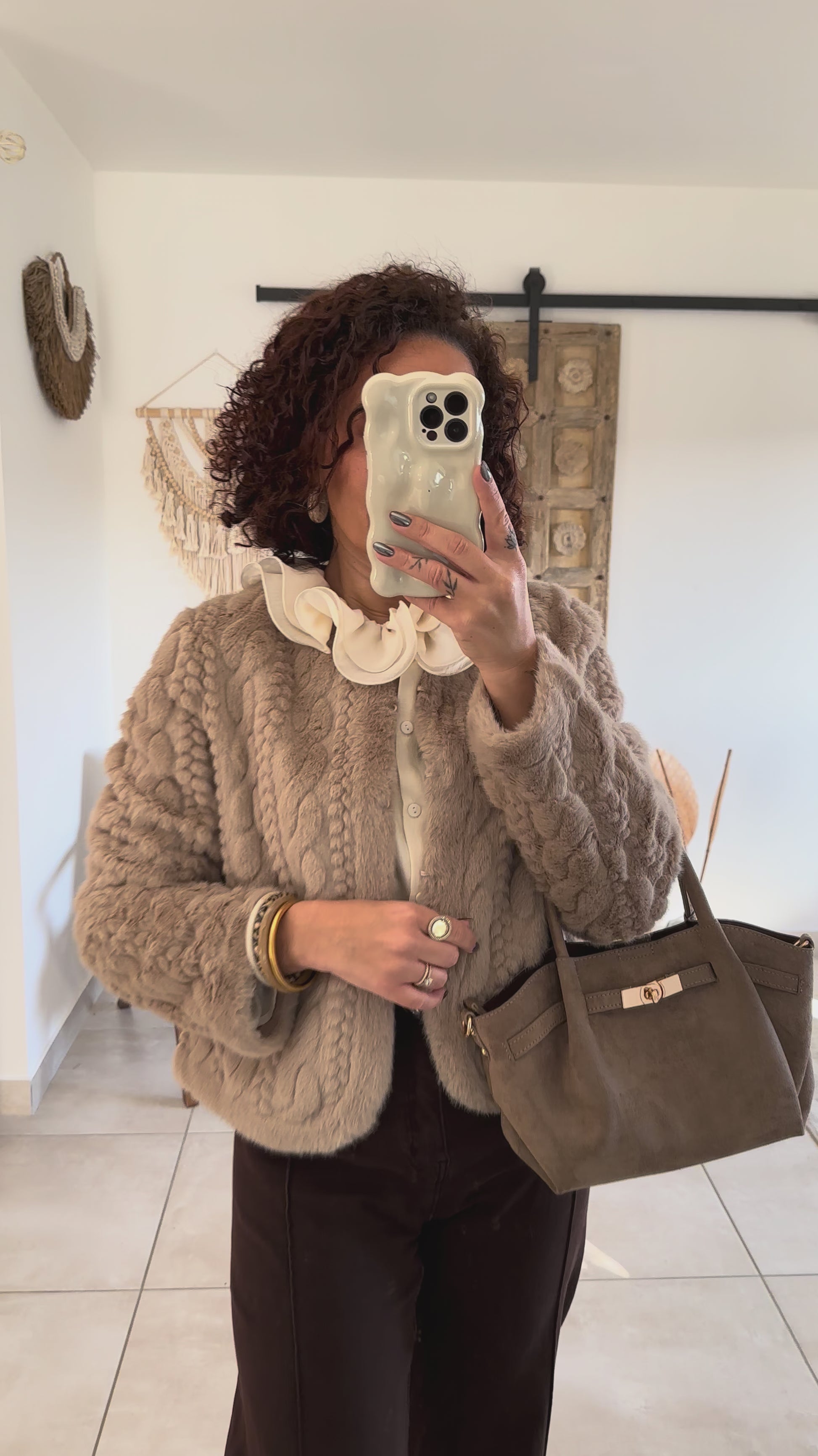 Douce, enveloppante et infiniment réconfortante, cette veste en fausse fourrure écrue est une véritable caresse à porter. Sa texture moelleuse et son motif délicatement travaillé apportent une élégance naturelle, idéale pour réchauffer une silhouette avec subtilité.